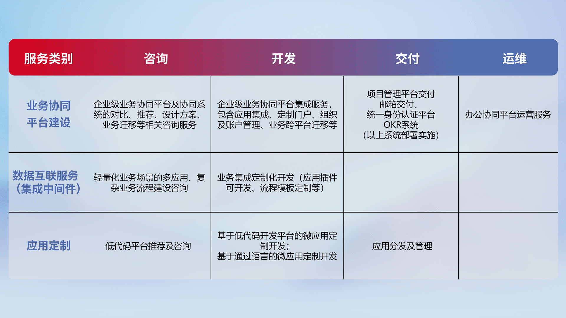 针对钉钉、、、、企微、、、IDaas等平台级产品提供产品的规划、、、、方案、、、交付、、、定制化开发等服务,,,实现如统一协同办公、、、智能客户服务、、、混合会议管理、、智能数据查询、、、等业务场景,,,,实现数字化转型。。。。